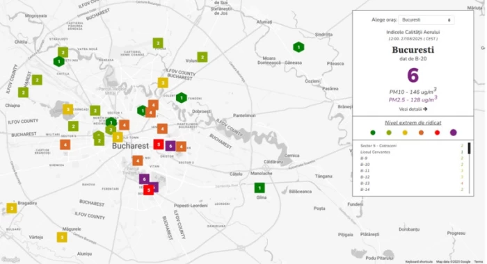 Valorile înregistrate de senzorii de poluare din Capitală, sunt cel puțin două stații de monitorizare a calității aerului din București care în momentul de față înregistrează indicele de calitate a aerului 4 – adică rău, vorbim despre valori care, comparativ cu noaptea trecută, la ora 22:00, sunt chiar și 10 ori mai mari, fiind vorba atât despre particulele PM10, cât și la particulele PM2,5.