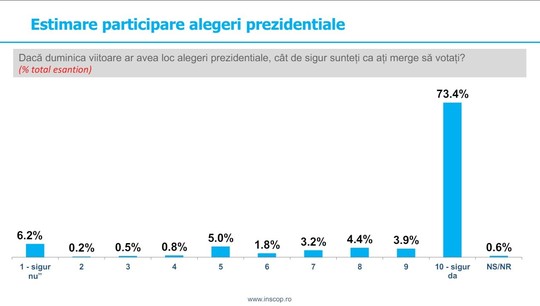 Pe o scară de la 1 la 10, în care 1 înseamnă că ”sigur nu” voi merge la vot şi 10 ”sigur da” voi merge la vot, 6.2% dintre români au ales 1, 0.2% au ales 2, 0.5% au ales 3, 0.8% au ales 4, 5% au ales 5, 1.8% au ales 6, 3.2% au ales 7. 4.4% indică 8, 3.9% – 9 şi 73.4% – 10. 0.6% reprezintă ponderea non-răspunsurilor, arată news.ro.