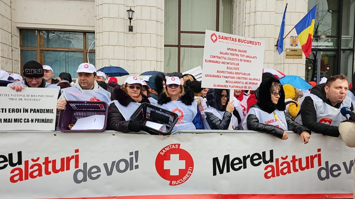 Angajații din sănătate protestează, joi, în fața Ministerului Muncii. Sindicatul SANITAS cere o majorare cu cel puţin 20% a salariilor tuturor categoriilor profesionale care lucrează în Sănătate şi Asistenţă Socială.