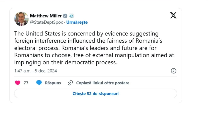 Printr-un parteneriat durabil, am înregistrat progrese importante în cooperarea în domeniul apărării și în parteneriatul nostru economic și am luat măsuri în vederea eliminării vizelor. Vom continua să lucrăm împreună pentru a menține securitatea națiunilor noastre și prosperitatea și bunăstarea cetățenilor noștri”, a declarat purtătorul de cuvânt al Departamentului de Stat, Matthew Miller, într-un comunicat, referindu-se la acuzaţiile de ingerinţă rusă formulate de autorităţile de la Bucureşti.