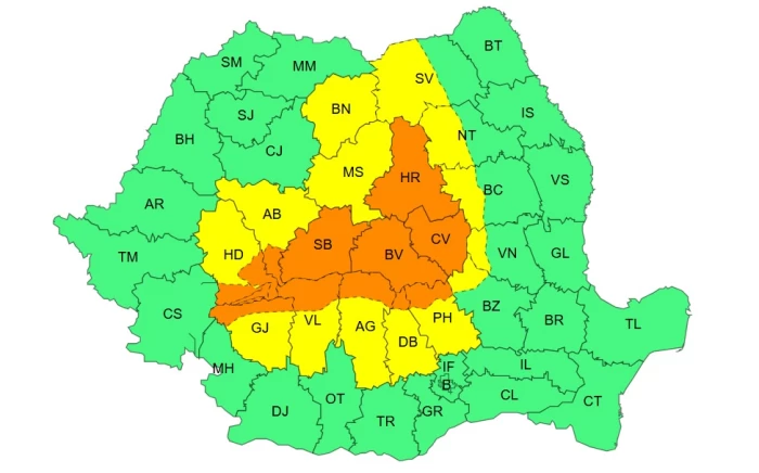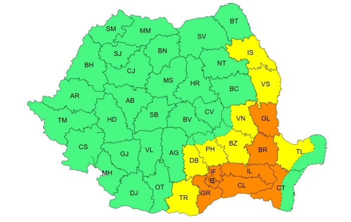 Se vor afla sub incidenţa unui Cod galben judeţele Suceava, Harghita, Braşov, Covasna, Dâmboviţa, Prahova, Buzău, Brăila, Teleorman, Giurgiu, Ilfov, Ialomiţa, Călăraşi şi municipiul Bucureşti, integral, şi, parţial, judeţele Bihor, Mureş, Constanţa, Tulcea şi Vrancea.