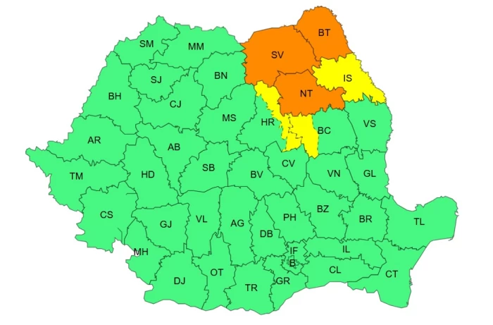Conform meteorologilor, luni, între orele 16:00-22:00, judeţele Suceava, Botoşani şi Neamţ se vor afla sub Cod Portocaliu de averse torenţiale, frecvente descărcări electrice, vijelii puternice (viteze ale vântului de 70…80 km/h) şi grindină de medii dimensiuni (2…3 cm). În intervale scurte de timp sau prin acumulare, cantităţile de apă vor fi de 30…40 l/mp şi pe arii restrânse de peste 50…60 l/mp.