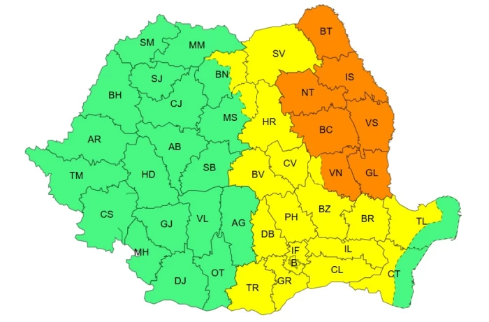 A fost emis Cod galben pentru judeţul Iaşi, integral, şi Harghita şi Bacău, parţial.