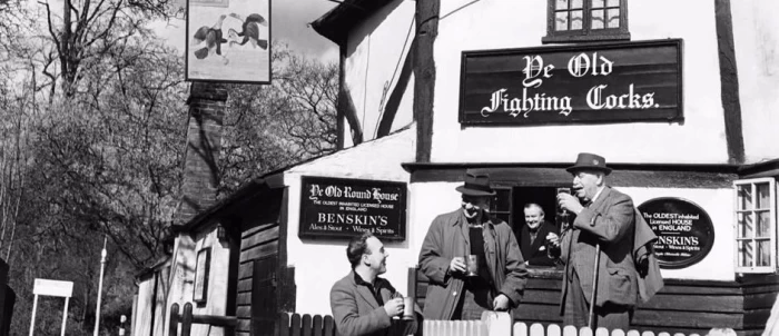 Ye Olde Fighting Cocks datează din secolul al VIII-lea. Catedrala St Albans e chiar peste drum și există tuneluri care se întind de la pivnița de bere la Catedrală. Luptele de cocoși – de la care pubul își trage numele – aveau loc în barul principal la sfârșitul secolului al XIX-lea și începutul secolului al XX-lea.