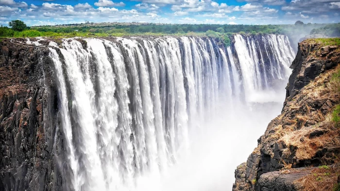 Se întinde pe 1.708 de metri în Zimbabwe și Zambia. Numele original al cascadei este „Mosi-oa-Tunya”, în traducere înseamnă „fumul care tună” și o găsim în Africa. Zgomotul acesteia se poate auzi chiar de la 30-40 de kilometri distanță, fapt care este fabulos.