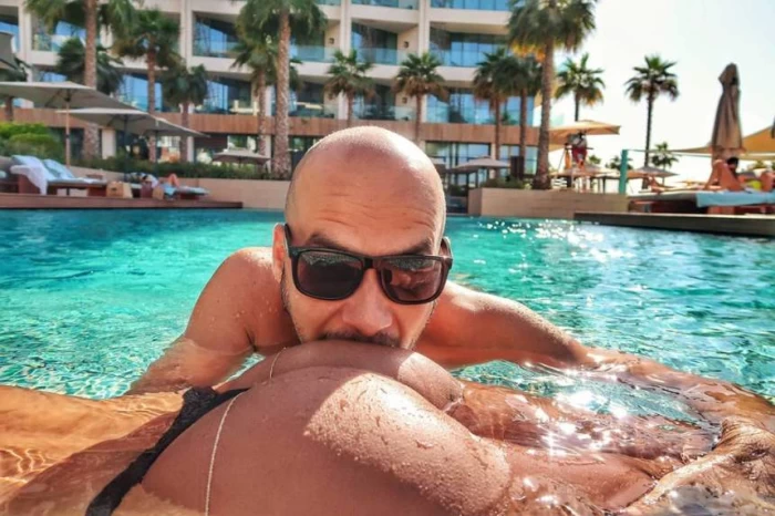 Deliric este domnul în cauză astăzi. Bărbatul a decis să iasă din piscina în care o „gusta” pe posterior pe Inna și să se „alăture” băiețește cu ai lui camarazi de business și cafele la trotuar.