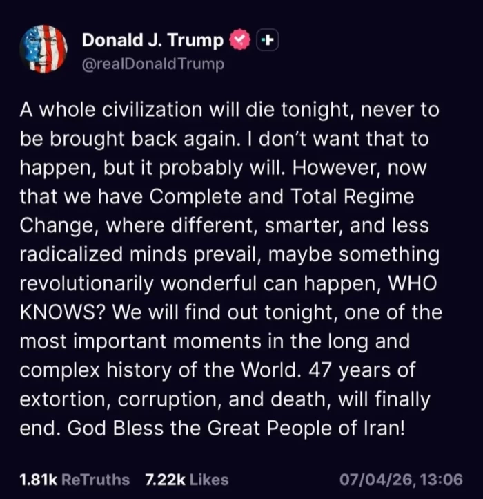 „O întreagă civilizaţie va pieri în această seară, fără să mai poată fi readusă la viaţă vreodată”, a scris Donald Trump marţi dimineaţa (ora Washingtonului) pe Truth Social.