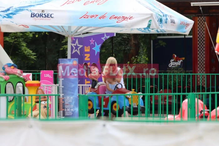 După o plimbare de câteva minute pe aleile parcului, Eva Maria și Elena Udrea s-au oprit la un alt loc de joacă, acolo unde micuța ”s-a dat” într-o mașinuță.