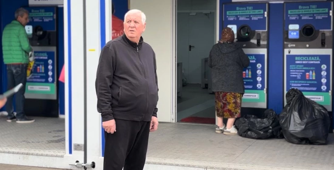„Mă numesc Dohotaru Ionel și pe 7 august fac 70 de ani. Sunt la pensie din 2009”, mi-a explicat cel care îi ajută pe oameni să recicleze sticle în RVM-urile din zona Lujerului.
