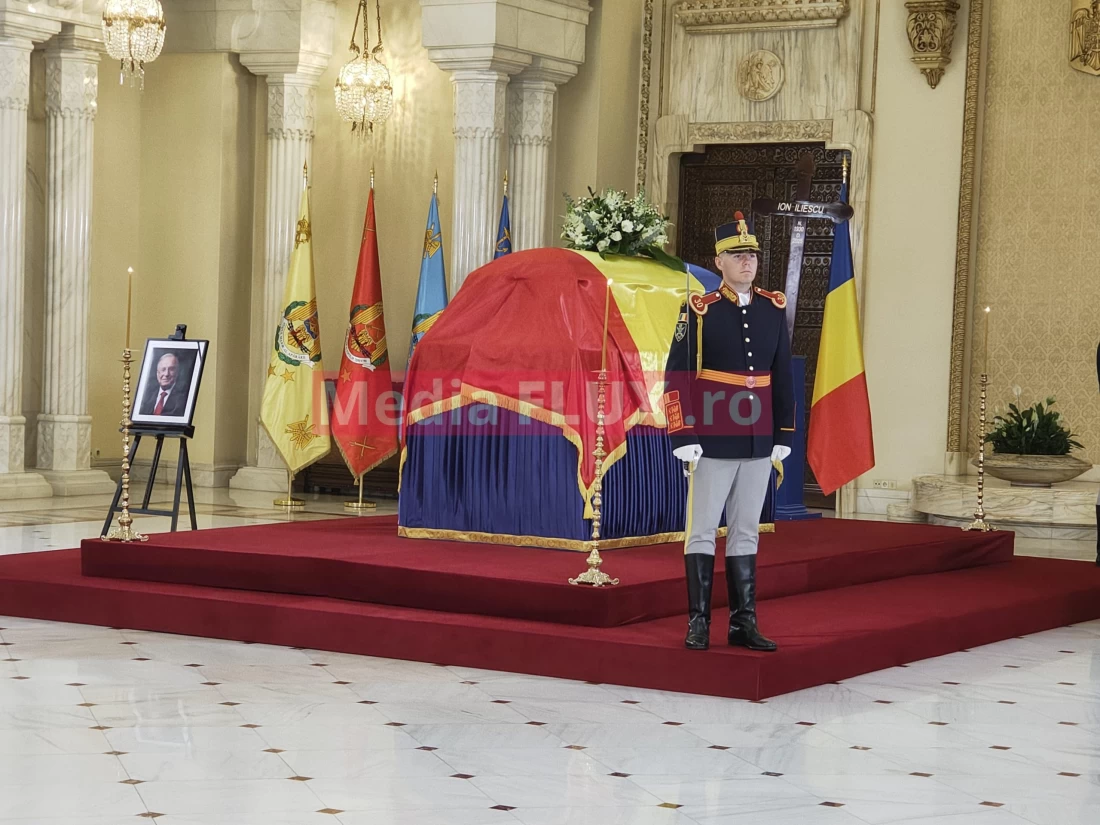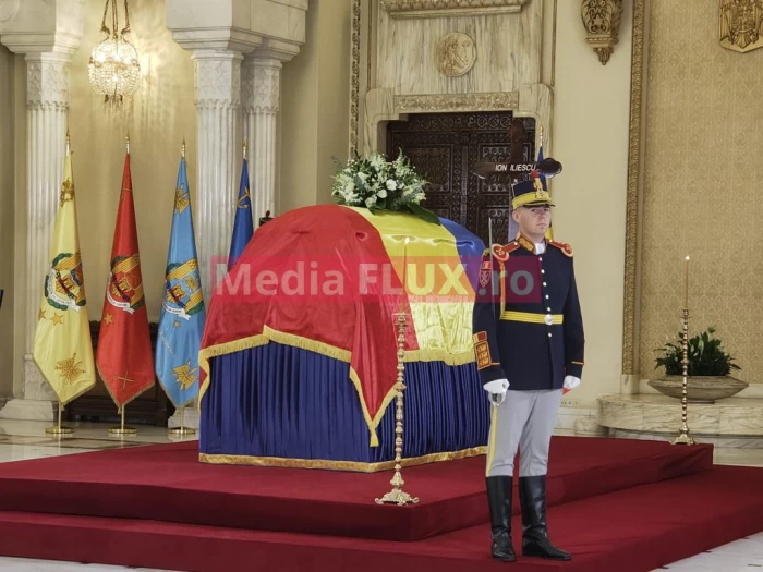 Sicriul cu trupul neînsufleţit al fostului preşedinte al României Ion Iliescu, acoperit cu Drapelul Naţional, a fost depus pe catafalc, miercuri dimineaţa, în Sala Unirii a Palatului Cotroceni.