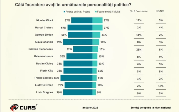 Un sondaj CURS realizat la nivel național în perioada 22-29 ianuarie 2022 îi poziționează pe premierul Nicolae Ciucă, liderul PSD Marcel Ciolacu și copreședintele AUR George Simion în topul încrederii românilor.