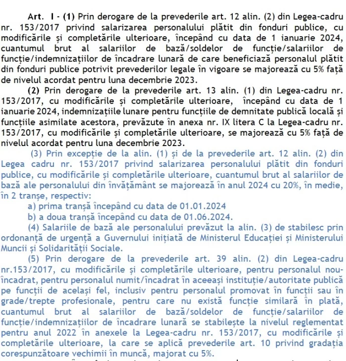 Acum se menționează că salariile „se majorează în anul 2024 cu 20%, în medie, în 2 tranşe: „prima tranşă începând cu data de 01.01.2024” și „a doua tranşă începând cu data de 01.06.2024”, dar nu mai precizează cu cât. Amintim că Guvernul promisese profesorilor o majorare de 40% de la 1 ianuarie, apoi a ajuns la cei 20%, dar în două tranșe, din care doar 13% creștere la 1 ianuarie.