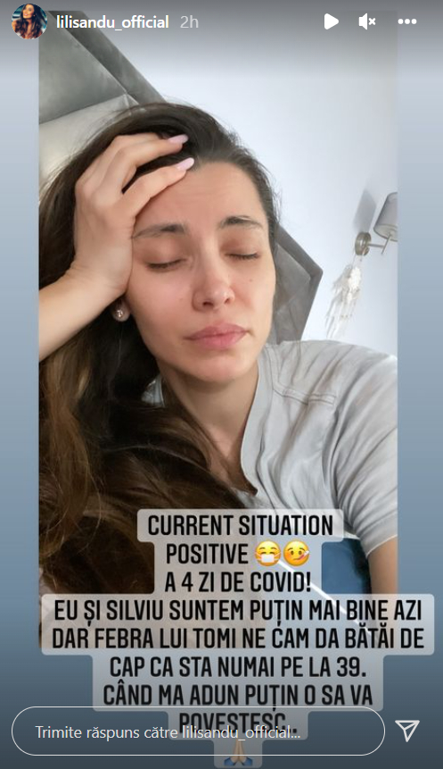 „A patra zi de COVID! Eu și Silviu suntem puțin mai bine azi, dar febra lui Tomi ne cam dă bătăi de cap că stă numai pe la 39. Când mă adun puțin o să vă povestesc”, a fost mesajul transmis de către Lili Sandu pe Instagram.