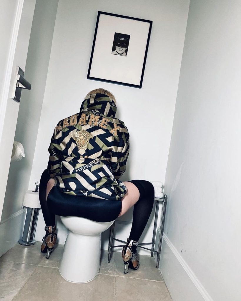 Și, pentru că Madonna ne-a obișnuit deja și cu ipostaze discutabile, și de data aceasta, pentru a-și evidenția și mai bine vânătaia, artista s-a pozat cu picioarele desfăcute spre cameră. Imediat, lângă, Madonna a postat și o fotografie cu ea stând pe toaletă.