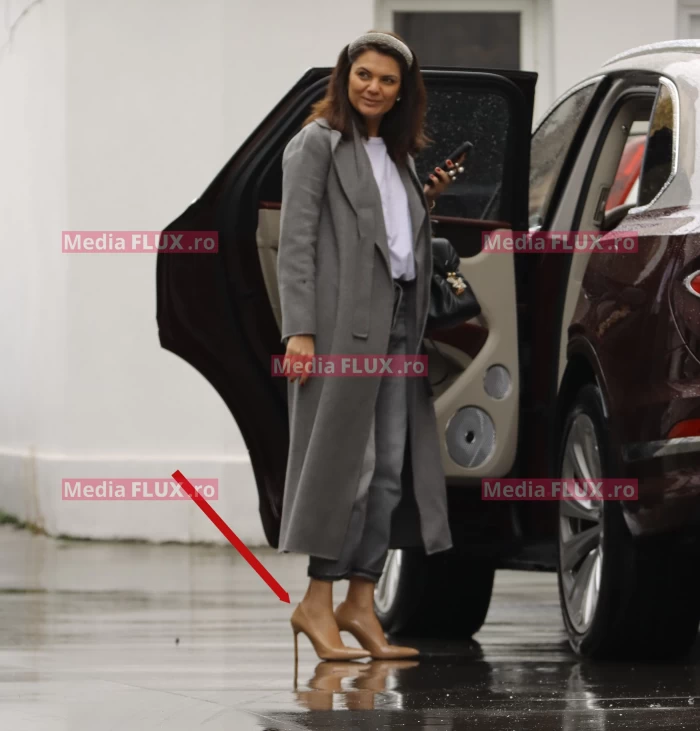 În momentul în care coboară din mașină, diva eleganței poartă o pereche de pantofi stiletto, crem, un modele extrem de elegant, la care ține cu siguranță, altfel, ne gândim că nu alegea să-i protejeze cu atât de multă ardoare de ploia de noiembrie târziu.