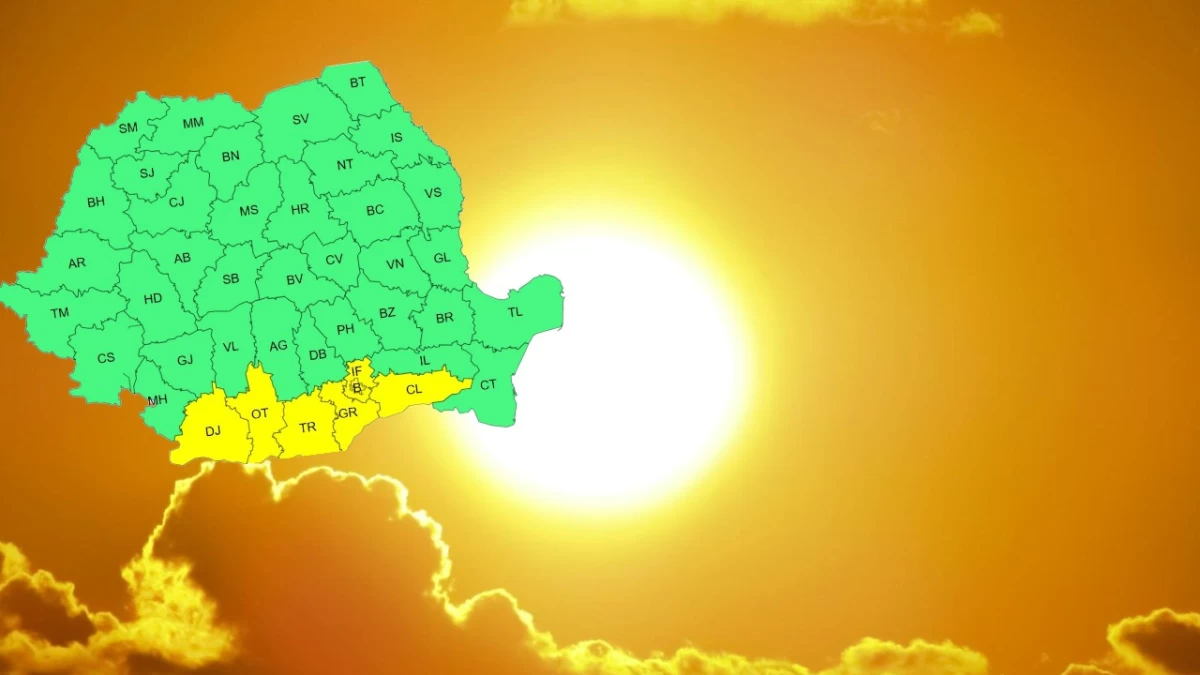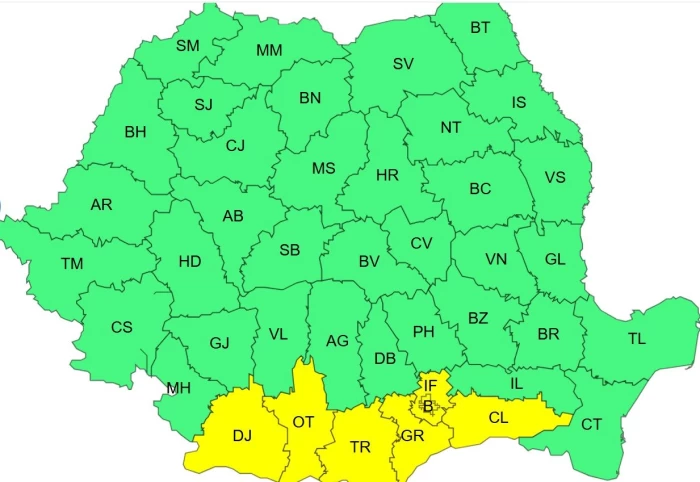 Pentru intervalul orar 12.00 – 21.00, ANM a emis cod galben de caniculă. Sâmbătă (30 august) în județele Dolj, Olt, Teleorman, Giurgiu, Călărași, Ilfov și municipiul București, vor fi temperaturi deosebit de ridicate, caniculă și disconfort termic, iar indicele temperatură-umezeală (ITU) va atinge pe arii restrânse pragul critic de 80 de unități.