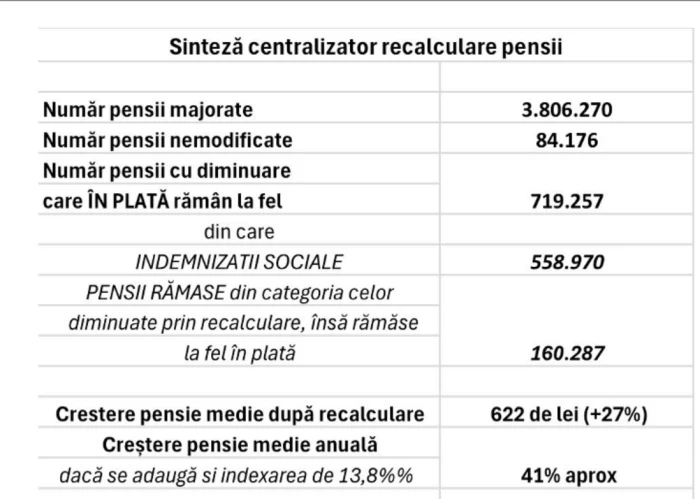 „În general, sunt două categorii de pensionari în această situație: Indemnizația socială pentru pensionari care nu scade sub 1.281 de lei, fiindcă, începând cu 1 septembrie, beneficiarii de indemnizație socială vor continua să primească suma minimă garantată de 1.281 de lei, indiferent de rezultatul în urma recalculării. În urma recalculării, dacă pensia este mai mică de 1.281 de lei, suma, diferența se suportă de la bugetul de stat ca și până acum.