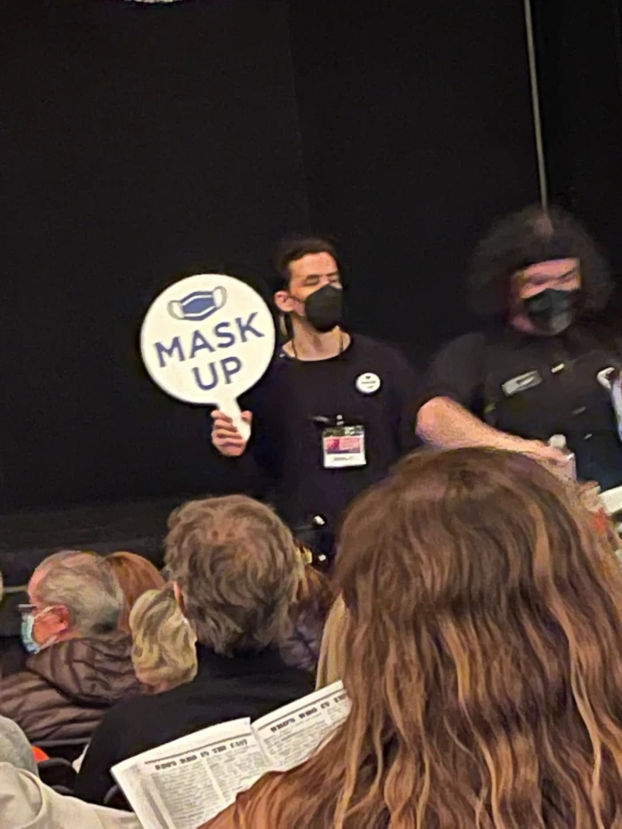 Mai jos, o imagine dintr-un teatru din New York unde oamenii sunt rugați să poarte în continuare mască.