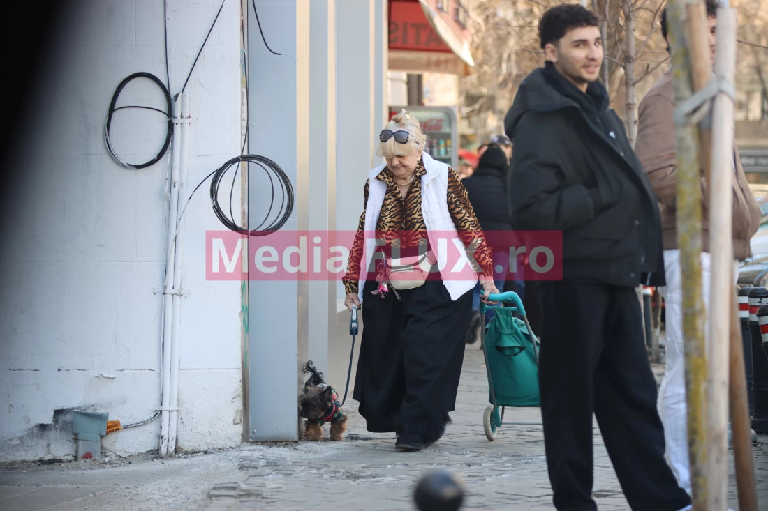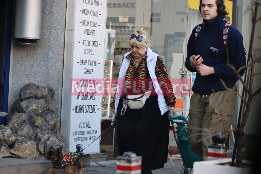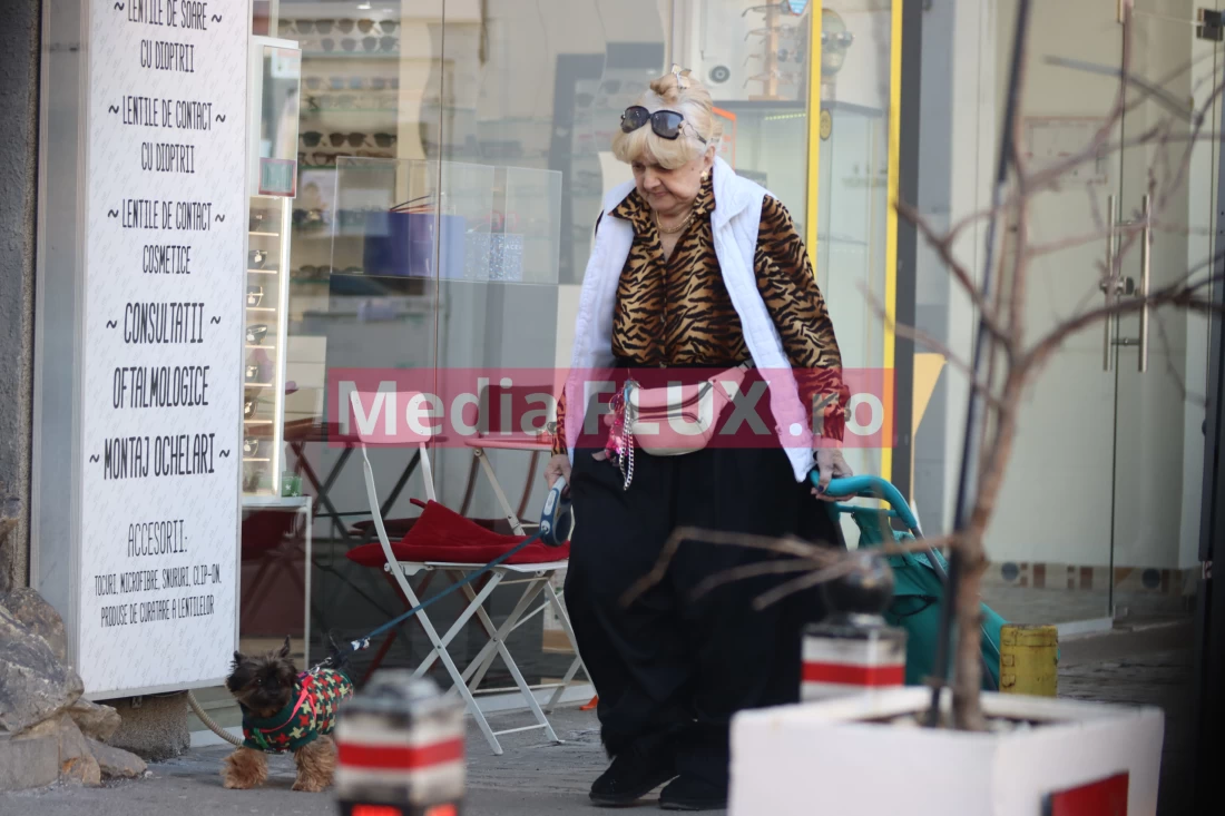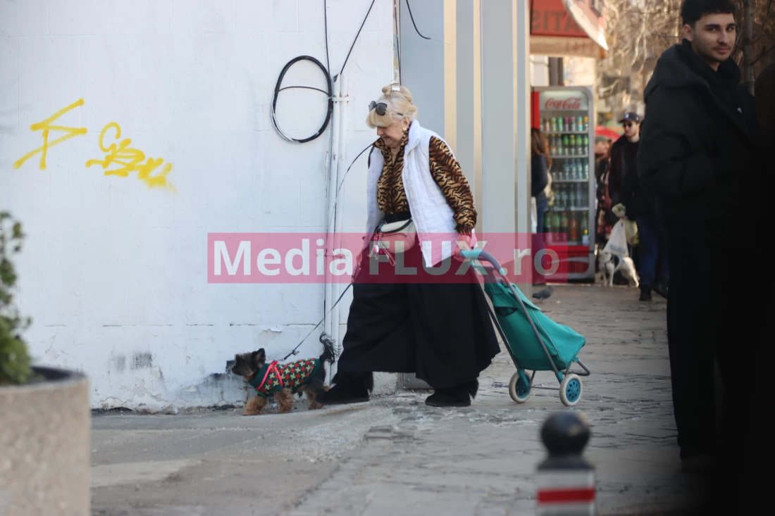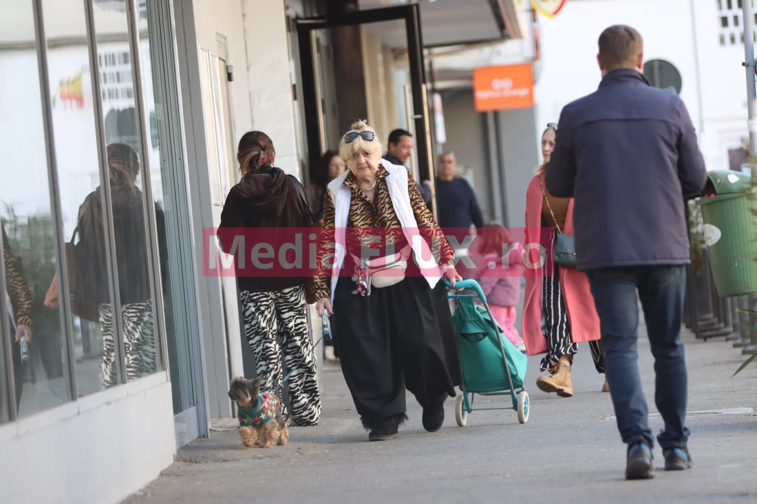 Jovială și cochetă cum o știm, cu un căruț de cumpărături și câinele după ea, doamna Mitoșeru s-a bucurat de o zi frumoasă cu soare pentru o sesiune de cumpărături.