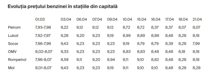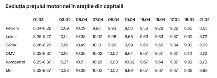 În urma ultimelor schimbări de la pompă, prețul motorinei standard în stațiile Petrom a coborât la 8,63 lei/l, iar în cele OMV la 8,72 lei/l, niveluri similare celor din prima parte a lunii martie. De altfel, actualele tarife sunt cu aproximativ 35 de bani peste cele înregistrate înainte de declanșarea conflictului din Orientul Mijlociu.