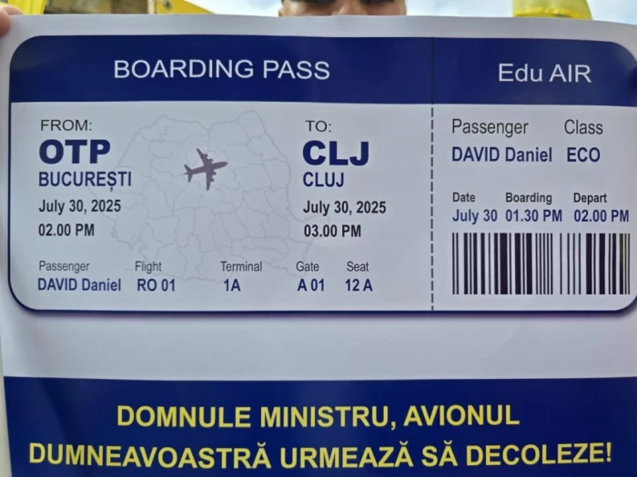 Participanții au venit cu pancarde și afișe ce prezentau un ”bilet de îmbarcare” pentru ministrul Daniel David, pe care sindicaliștii îl ”trimit” cu avionul ”Edu Air” la Cluj, potrivit edupedu.ro.