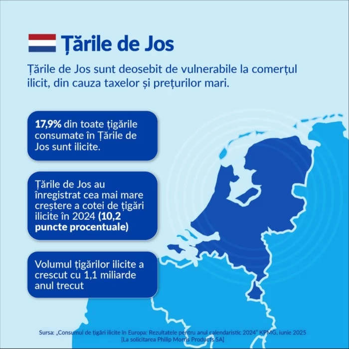 Raportul KPMG din 2024 arată că creșterea consumului de țigări ilicite a fost determinată în principal de Franța și Țările de Jos. Situația este deosebit de alarmantă în Franța, unde au fost consumate 18,7 miliarde de țigări ilicite în 2024, dintre care aproape 7,8 miliarde au fost contrafăcute. În Țările de Jos, volumul țigărilor ilicite a crescut drastic cu 1,1 miliarde—mai mult decât dublu față de anul anterior—ajungând la 17,9% din consumul total. Dacă aceste țigări ar fi fost achiziționate legal, Franța ar fi colectat suplimentar 9,4 miliarde de euro din taxe, iar Țările de Jos aproape 900 de milioane de euro. În Regatul Unit, volumul țigărilor ilicite a scăzut cu aproape 0,8 miliarde în 2024, deși ponderea acestora în consumul total a rămas stabilă. Regatul Unit rămâne a treia cea mai mare piață ilicită din Europa, cu 5,9 miliarde de țigări ilicite consumate anul trecut.