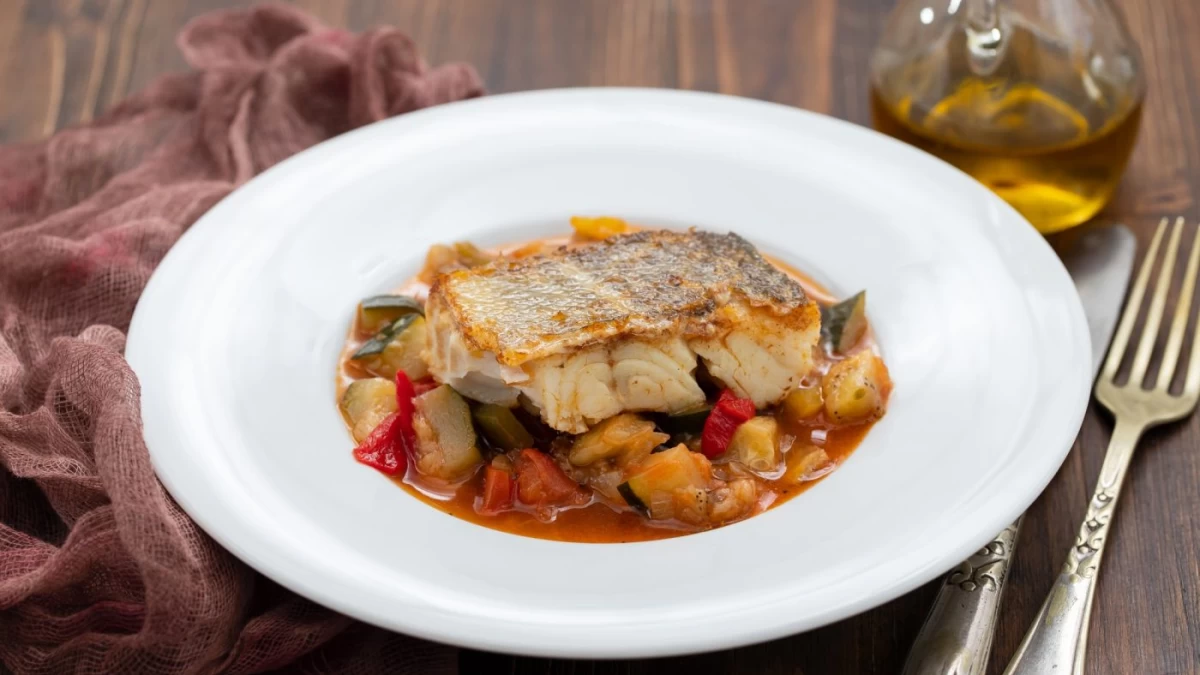 După ce legumele s-au înmuiat, spălați și decojiți roșiile, apoi tăiați-le în cuburi mai mici. Puneți-le și pe ele în tigaie. Mai apoi, adăugați o ceșcuță de apă, sucul de roșii și puțin vin. Bineînțeles, acesta este opțional. Amestecați-le foarte bine. Trebuie să iasă un sos. Puneți sare și piper după gust. Adăugați bucățile de pește și mai lăsați pe foc câteva minute.