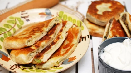 După aceea, formați biluțe nici prea mari, nici prea mici și începeți să formați plăcintele. Întindeți câte o foaie potrivită, în mijloc puneți umplutură, închideți-o bine și mai întindeți o dată. Transferați-o la prăjit într-o tigaie cu puțin ulei. Poftă bună!