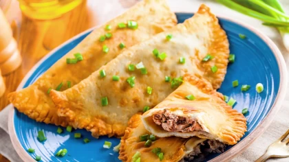 Întindeți fiecare biluță cu sucitorul, să nu fie foaia nici prea groasă, nici prea subțire. Puneți umplutură pe jumătate din discul de aluat. Pliați-l și presați marginile cu ajutorul unei furculițe. Procedați astfel și cu celelalte biluțe. Într-o tigaie, puneți uleiul la încins și începeți să le prăjiți. Ari fi bine ca focul să fie la mic, sau cel mult la mediu. Poftă bună!