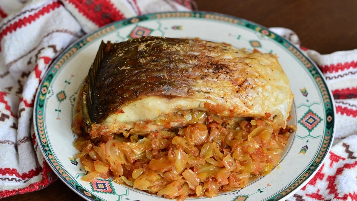 Pește să fie tăiat în trei-patru, depinde cât de mare sau mic e. Bucățile trebuie să fie potrivite, ca mărime. Când varza este rumenită, puneți și peștele deasupra. Mai lăsați aproximativ 30-40 de minute, până când este și peștele gata. Puteți degusta cu mămăligă și ardei iute murat. Poftă bună!