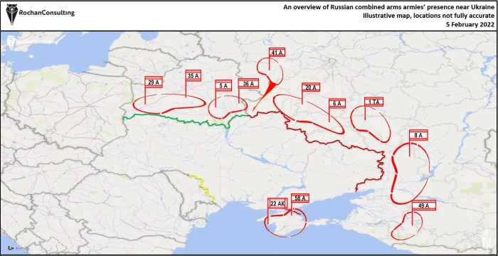 O hărtă a distribuției trupelor rusești la granițele Ucrainei, realizată de CNN, pe baza estimărilor Statelor Unite indică faptul că, în acest moment, Ucraina ar fi înconjurată din trei părți. Analiștii avertizează că un atac este iminent. A fost avansată chiar și ipoteza unui moment exact: