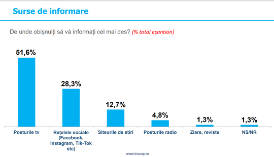 51.6% dintre români obişnuiesc să se informeze cel mai des de la posturile TV, 28.3% de pe reţelele sociale, 12.7% de pe site-urile de ştiri, 4.8% de la posturile de radio şi 1.3% din ziare şi reviste. Nu ştiu sau nu răspund 1.3% dintre cei chestionaţi.