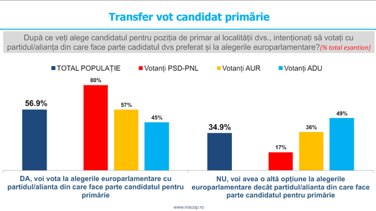 Mai mult de jumătate dintre cei intervievaţi spun că vor vota la alegerile europarlamentare cu partidul din care face parte candidatul preferat pentru primărie, cei mai numeroşi din această categorie fiind votanţii PSD-PNL.