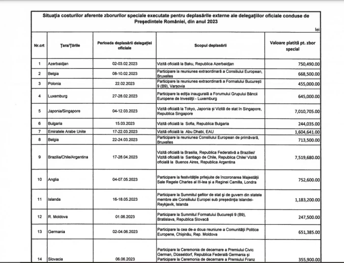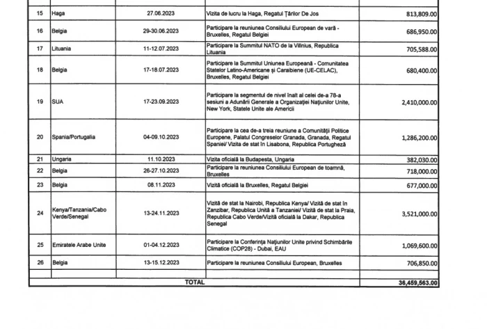 Tot 2023 a fost și cel mai scump an, peste 36 milioane de lei cheltuiți pentru zboruri. Turneul african din 2023 a însumat peste 3,5 milioane de lei (Kenya, Tanzania, Capul Verde, Senegal).