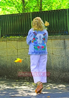 Privește-o cât de frumos poartă, pe străzile din zona de nord a Capitalei, o pereche de blugi albi cu talie înaltă, o pereche de sandale din piele cu platformă și, fără discuție, piesa de rezistență, aceasta superbă geacă de blugi „îmbogățită” de o serie de mesaje și elemente pictate manual.