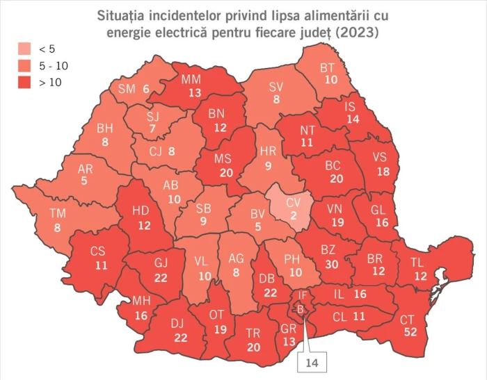 Din perspectiva distribuției geografice a incidentelor provocate de probleme de alimentare cu energie electrică, în județul Constanța s-au înregistrat cele mai multe astfel de incidente (52), urmat de Buzău (30). Județul cu cele mai puține raportări de incidente electrice a fost Covasna, cu 2 astfel de incidente. 52% din totalul incidentelor raportate au fost incidente electrice.