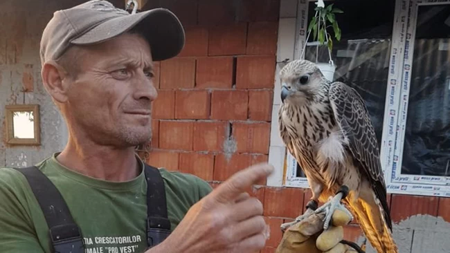 Arădeanul în curtea căruia a coborât șoimul care valorează peste 20.000 de euro spune că pasărea era neașteptat de blândă și, pentru că este crescător de porumbei, și-a dat seama că era dresată.