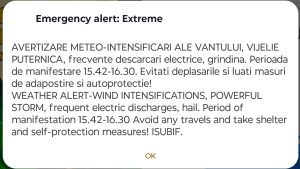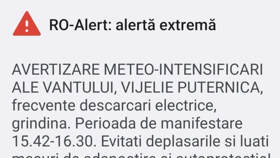 WEATHER ALERT-WIND INTENSIFICATIONS, POWERFUL STORM, f requent electric discharges, hail. Period of manifestation 15.42-16.30 Avoid any travels and take shelter and self-protection measures! ISUBIF”, este mesajul transmis de ISU București Ilfov.