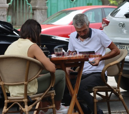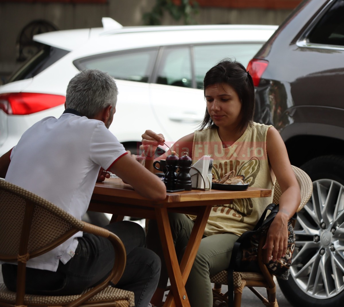 Actorul a ieșit la terasă cu o domniță dragă lui, după sărutul pe care l-a primit de la ea, alături de care s-a relaxat la o cafea și o salată de foarte bună calitate. Au discutat tot timpul, au făcut schimb de impresii despre cele descoperite în telefonul mobil, s-au bucurat de vicii nevinovate, ea salată cu de toate, el tutun de calitate, și au pornit apoi, cu mașina domnului, către umătoarea destinație a zilei.